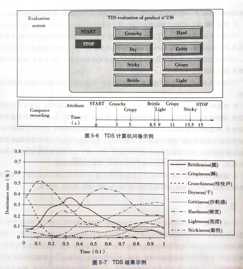 TDS(temporal dominance of sensations)法是一種時間-強度(TI)方法的延伸,這兩種方法都是隨著計算機系統(tǒng)的應用而逐漸得以實現(xiàn)并發(fā)展的,均是動態(tài)感官評價的方法,不同的是時間-強度方法只針對一種感官屬性的強度進行評價,而TDS法是針對多個感官屬性進行評價。在TDS 實驗中,要求評價員動態(tài)的進行評價,并在一段時間內(nèi)給出不同階段占主導地位的感官屬性,主要感官屬性不一定是強度最大或者較大的感官屬性,關于主要感官屬性的定義有:能夠引起注意的感官屬性、持續(xù)增加并突然能被感知的感官屬性。感官專業(yè)人員通過分析實驗結果,從而獲得不同樣品的主要感官屬性描述圖,常見的結果呈現(xiàn)方式是TDS曲線。問題和結果示意圖見圖5-6、圖5-7。